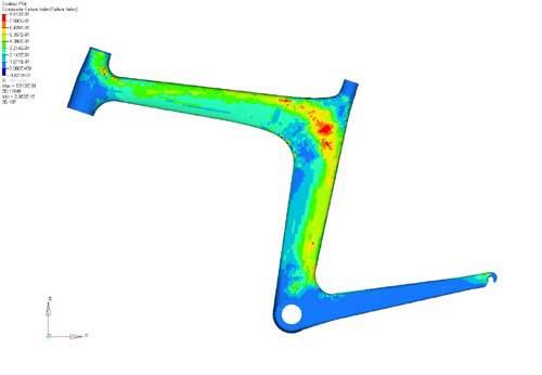 CFRP解析の可能性研究を目的とした自転車用CFRP製フレームの解析結果(例)とその試作品です。