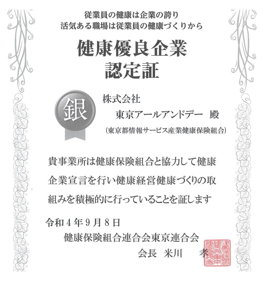 東京アールアンドデーは、令和4年9月8日に健康優良企業 “銀の認定”ロゴマークを取得いたしました。