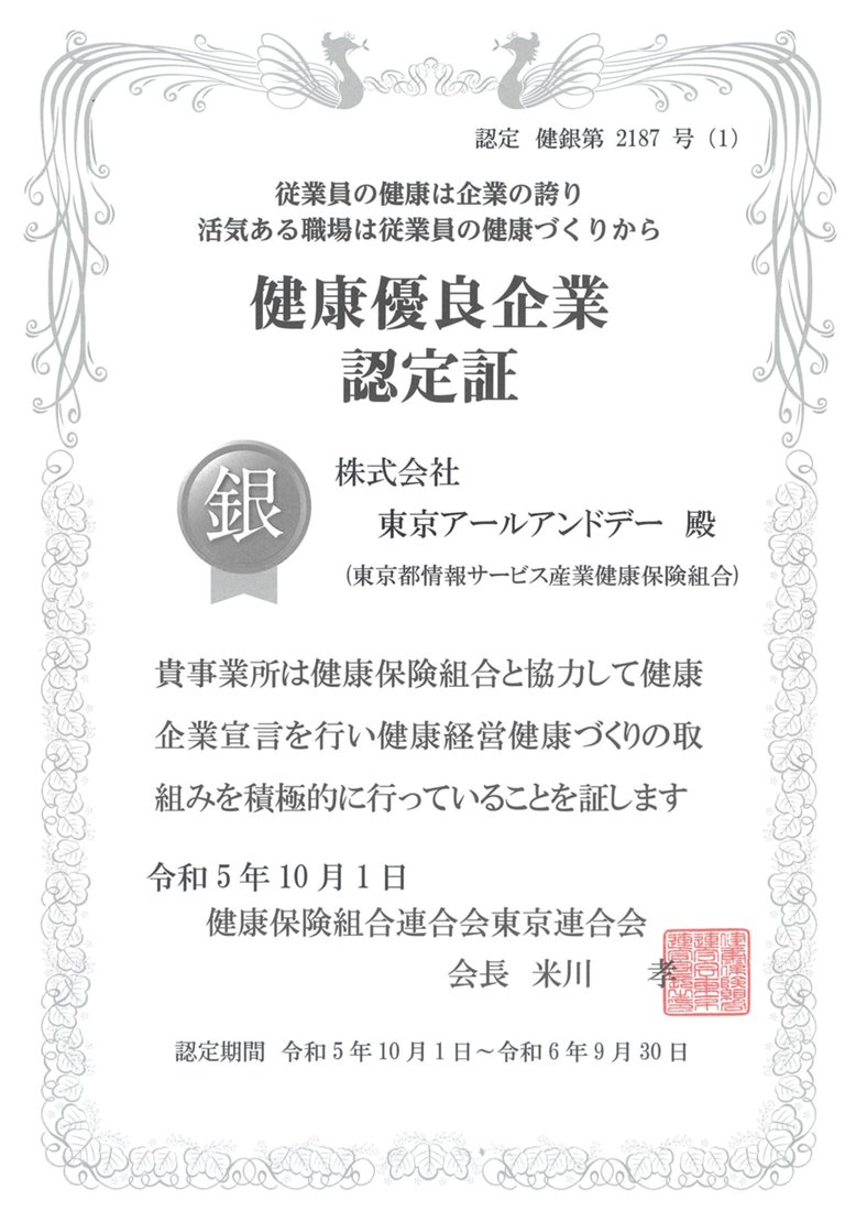東京アールアンドデーでは、健康経営の取組みによる企業の発展、社員の皆様の健康保持・増進を目指し「健康企業宣言」を行い、「健康優良企業/銀の認定」の取得に取り組んで参りました。